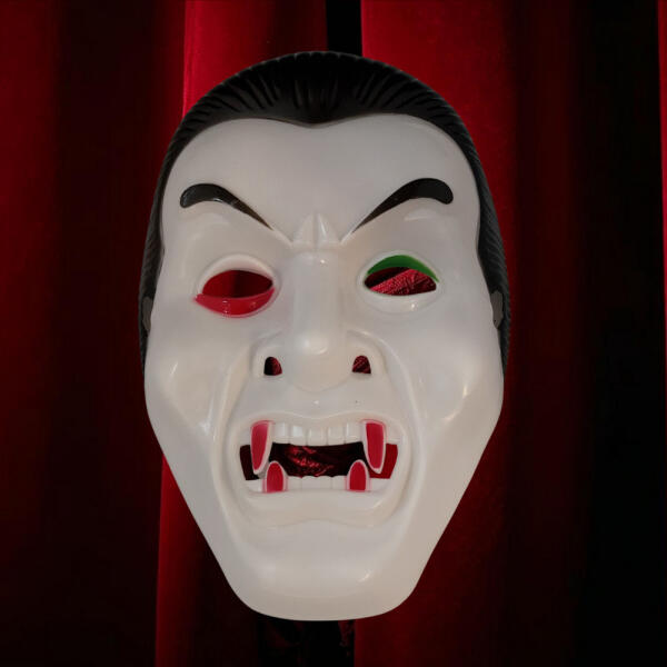 Vámpír maszk Lehetsz Drakula egy álarcosbálon, farsangon vagy akár egy Halloweeni buliban. Anyaga műanyag. Gumipánttal rögzíthető.